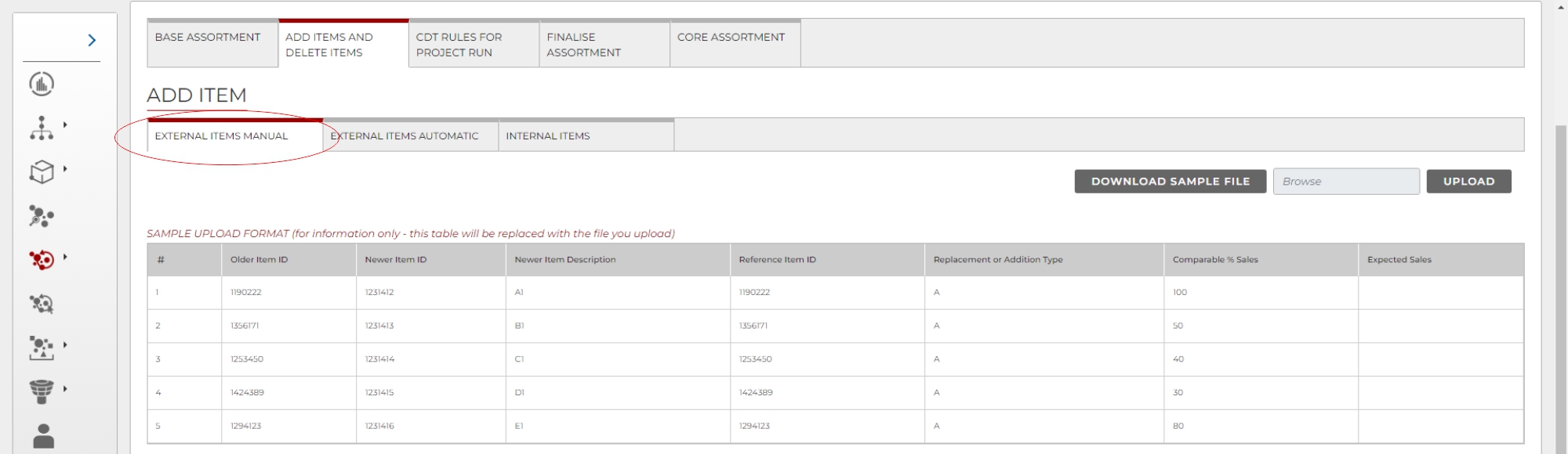 La schermata viene utilizzata principalmente per aggiungere ad un progetto gli articoli che sono stati trovati come opportunità di assortimento sul mercato o come nuove linee future. L’utente può inserire dati da GFK o qualsiasi altra fonte di informazioni di mercato per aggiungere prodotti all’assortimento.