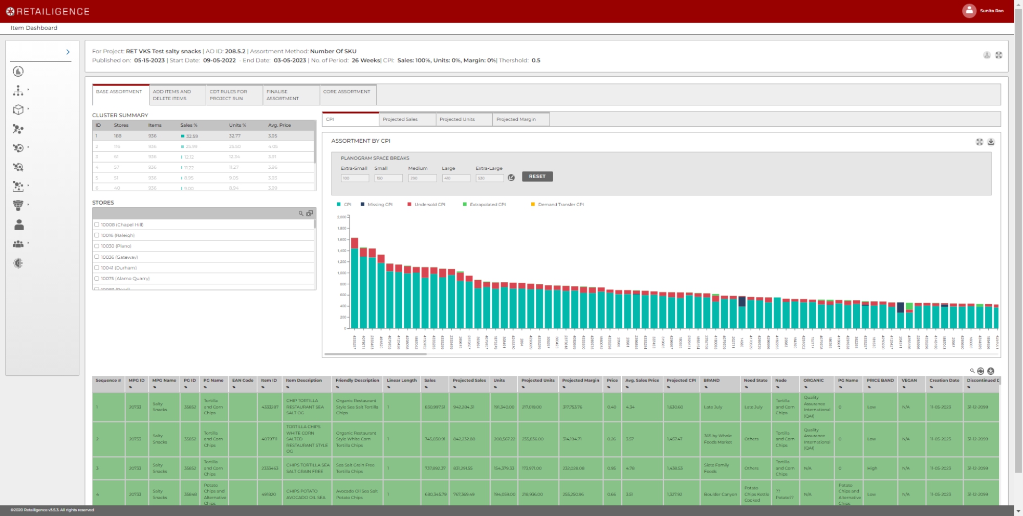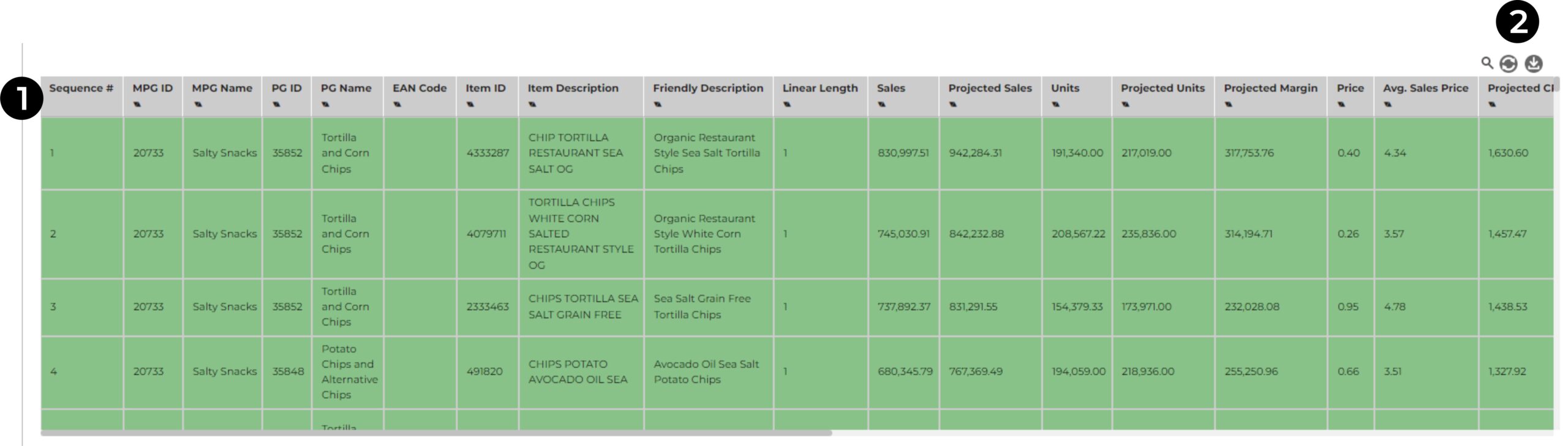 Quando viene selezionato un cluster specifico (Fig 1. Punto 2), la tabella dei dati dell’assortimento apparirà sotto il grafico dell’assortimento, visualizzando i prodotti per il cluster in ordine di importanza.
