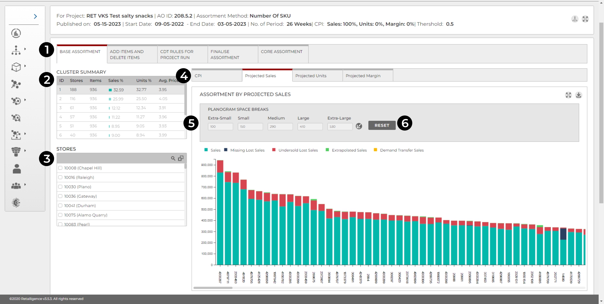 Assortimento spazio per vendite consente di visualizzare l’output che verrà implementato al termine del processo di assortimento. Lo schermo consente di visualizzare i grafici delle prestazioni dei prodotti per ciascun cluster, con una tabella sottostante che mostra come i potenziali intervalli si adatteranno a ciascuna interruzione di spazio.