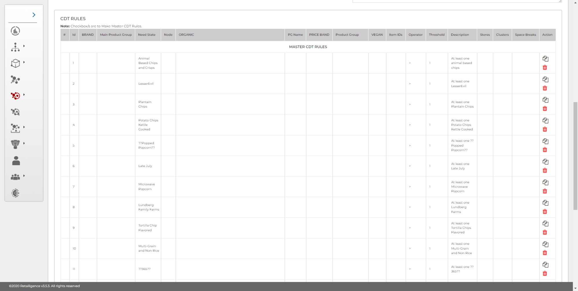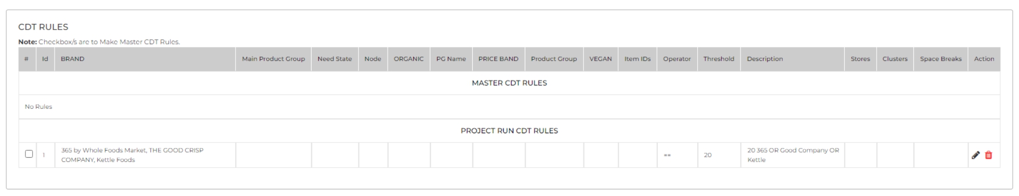 La schermata Regole CDT per Esecuzione progetto consente di creare regole per manipolare l’output del processo di assortimento. Le ragioni per creare regole potrebbero includere decisioni strategiche basate sul mercato, sul finanziamento dei fornitori o su fattori esterni di cui lo strumento Retailigence non è a conoscenza.