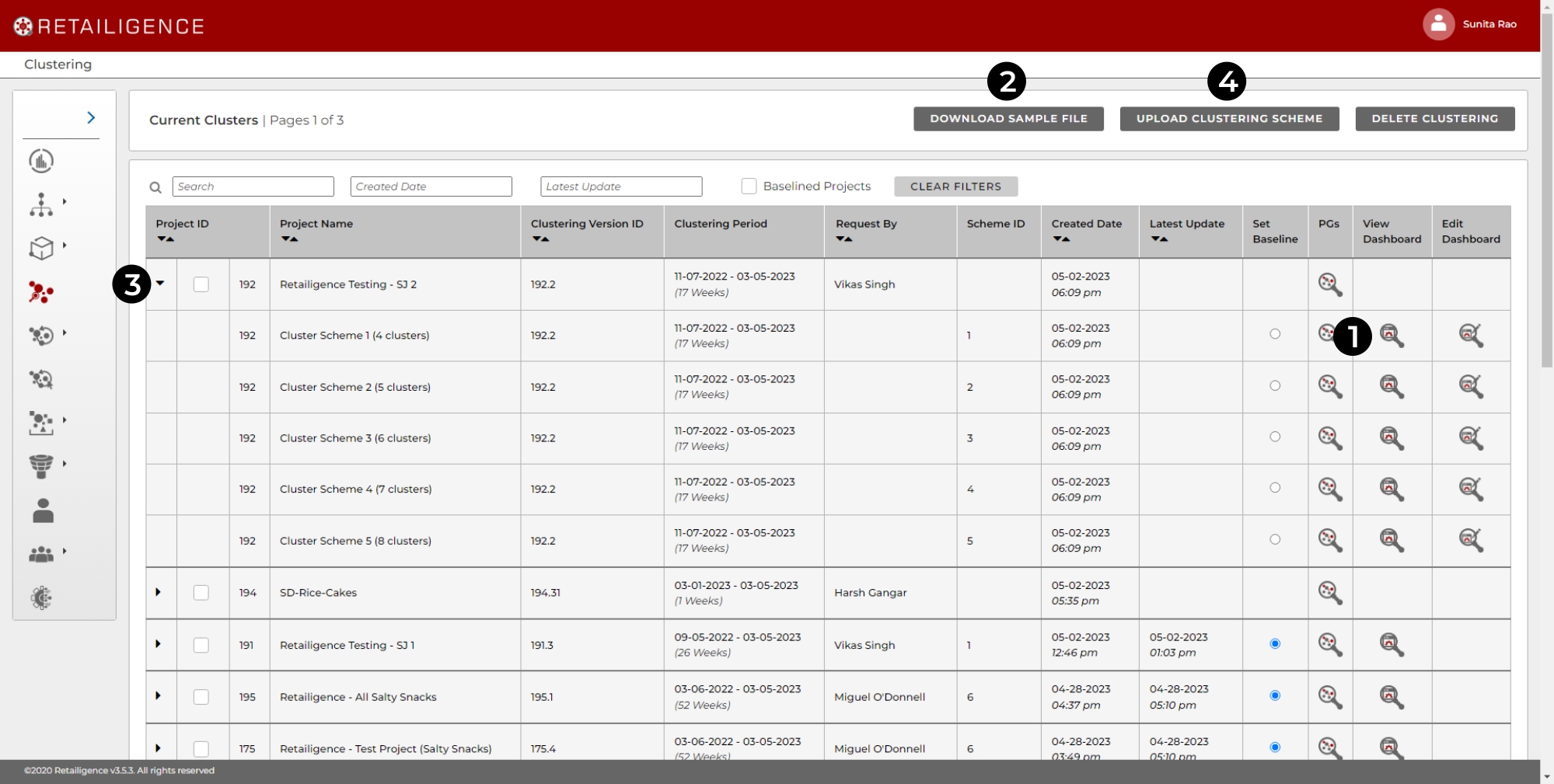 - Dashboard – Use the icon to view the clustering dashboard. In the first screen of the dashboard (Cluster Summary), scroll down to the data table and click download (Highlighted in Fig 2. below)